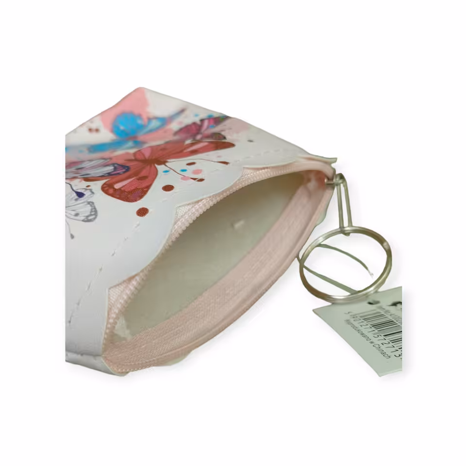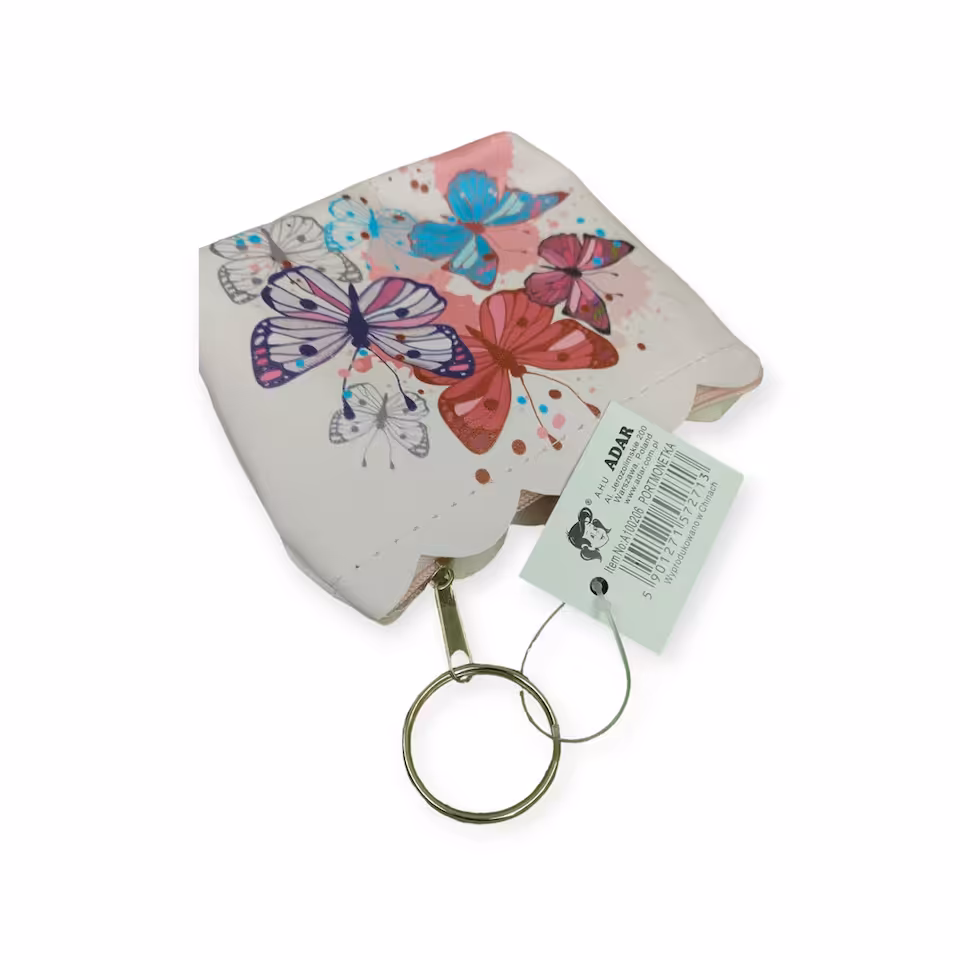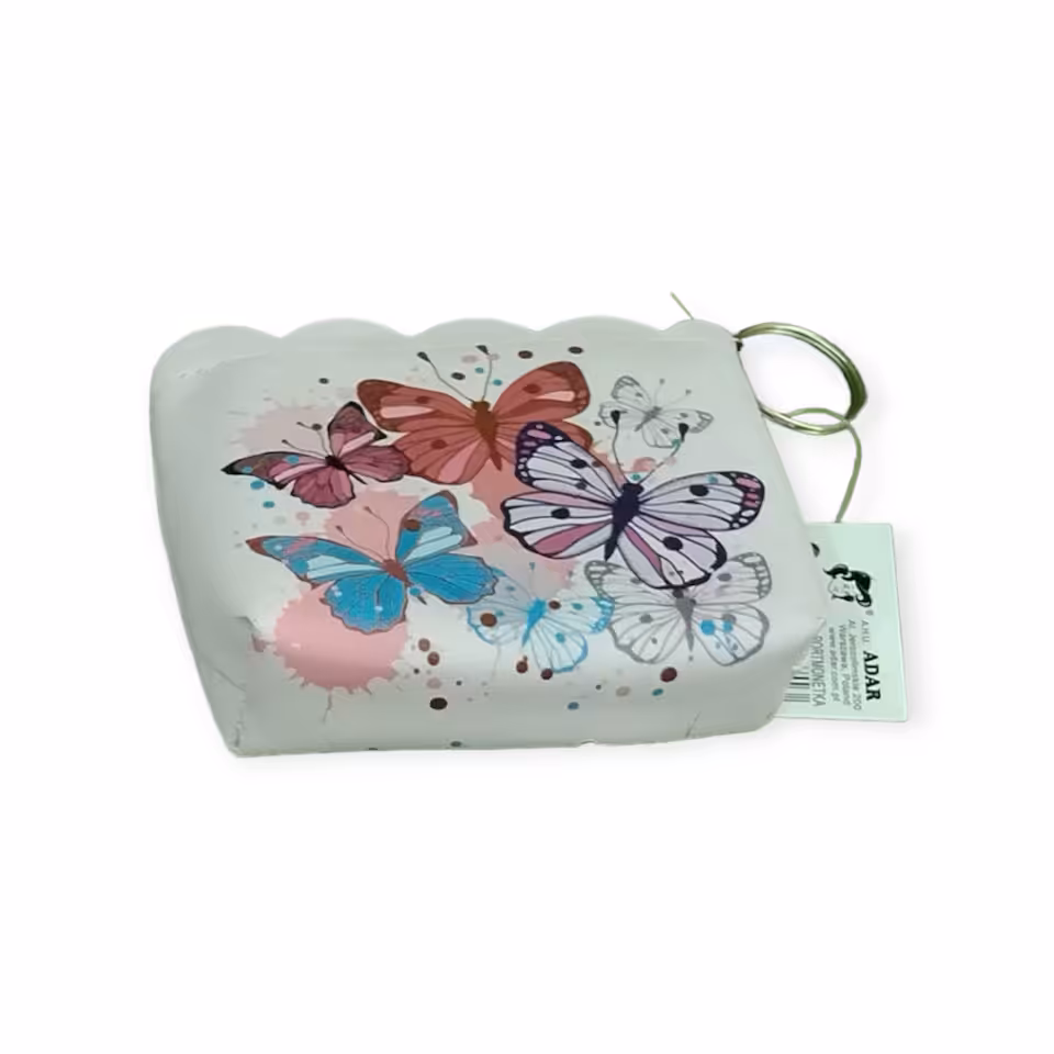 Różowa mała portmonetka z motylkowym wzorem - praktyczny i modny wybór dla każdej kobiety.